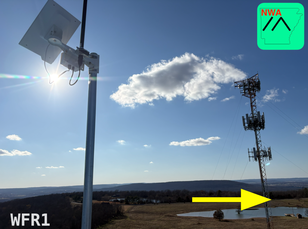 On the topic of cell towers… We have RF filters on order for WFR1 to see if that will resolve our issues there. Today I was at the site and sent a test message from the dirt road about a 1/4 mile from the tower (arrow in picture) and it seemed to get out pretty well. I was only able to get a trace route to WFR1 about 200 yards away. I certainly haven’t given up on the site, but it is not working at this point.